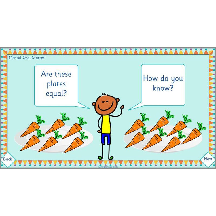 The third lesson in this series encourages your class to explain what 'equal' means. The children will be encouraged to decide if representations are equal to each other or if one has more or less than the other. These activities will promote the use of mathematical language, reinforcing terms such as; equal, more than, less than, fewer, most and least. This lesson contains a lesson plan, slides, activity ideas,