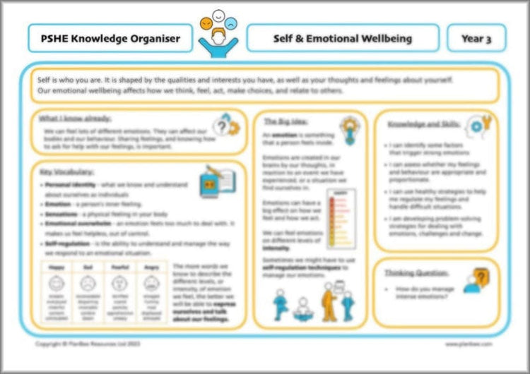 This Year 3 PSHE Knowledge Organiser has been created to complement our PSHE Self and Emotional Wellbeing strand. It is designed to support your children’s understanding of key vocabulary linked to this scheme of work. A thinking question and a big idea have been included to encourage your children to think deeply about this topic.