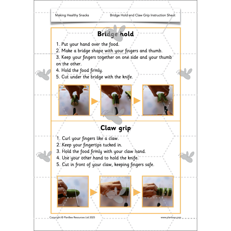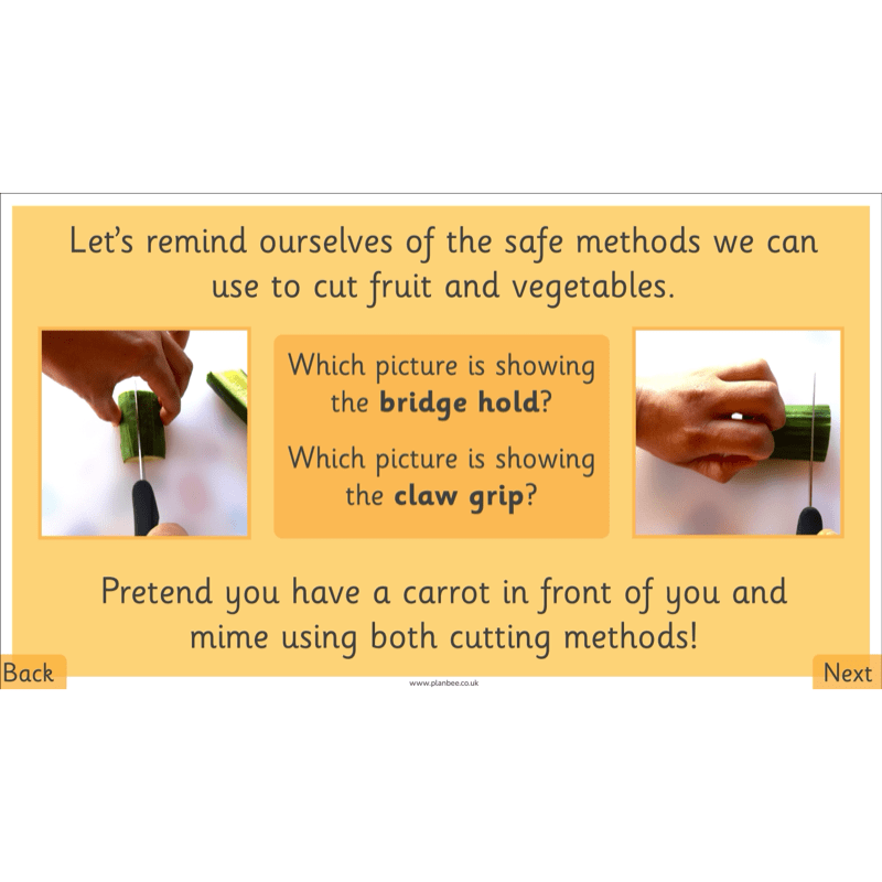 In this lesson, children will build on their knowledge of fruits and vegetables by learning how to cut them safely using the bridge hold and claw grip. They will be reminded of the importance of hygiene, including washing hands and cleaning surfaces before preparing food.