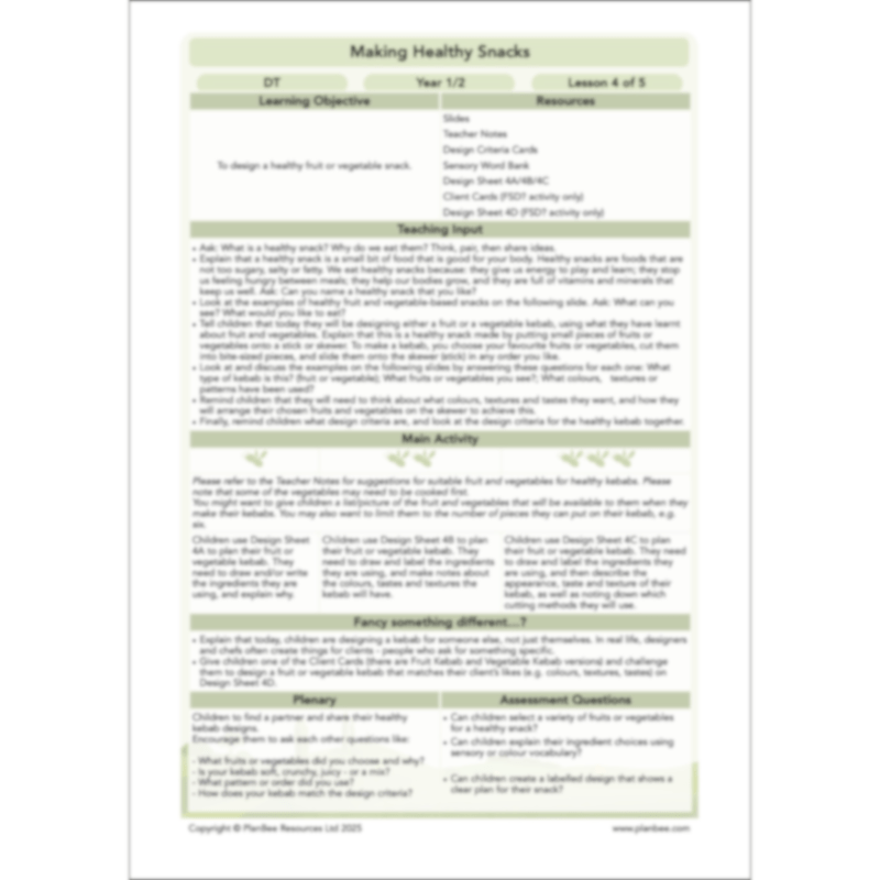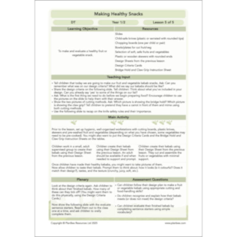 This KS1 DT lesson pack includes an easy-to-follow plan, PDF teaching slides, differentiated activity ideas and printable resources.