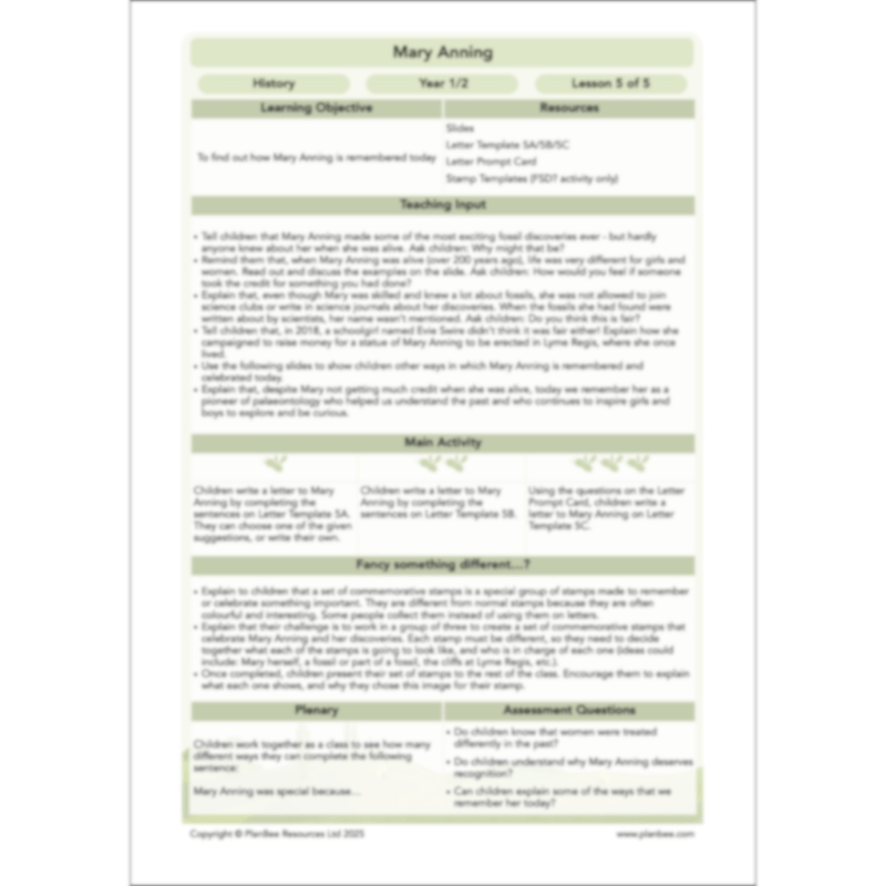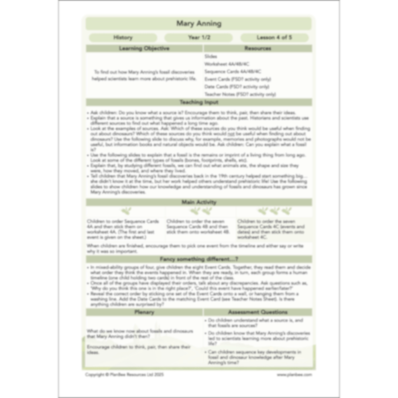 Each lesson in this Mary Anning KS1 planning pack includes a detailed plan, a set of engaging and informative PDF slides for the teaching input, differentiated activity ideas and a range of printable resources to support your class in their independent work.