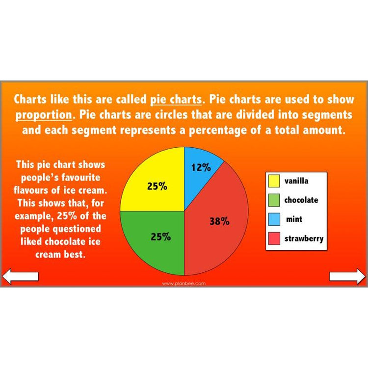 The included slides with this lesson describe the features of pie charts, then ask children to read and interpret data presented in them. Following this, either challenge children to ask and answer their own questions about data in pie charts, or undertake group activities where children will draw their own simple pie charts.