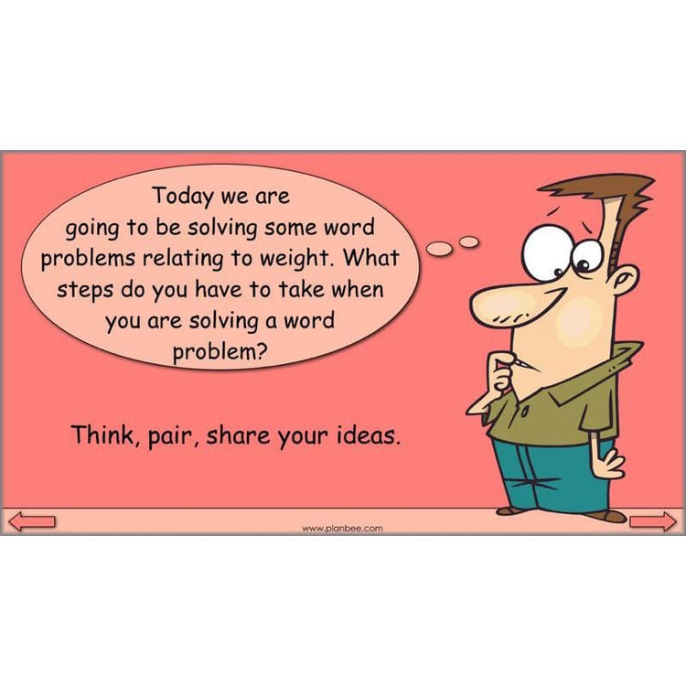 Now that children have some strategies under their belts to add and subtract weights, they can put their skills to the test as they solve a variety of word problems relating to length. There are a variety of problems for children to solve as a class on the slides (with explanations for how problems were solved if they get stuck) to prepare them for solving similar problems independently.