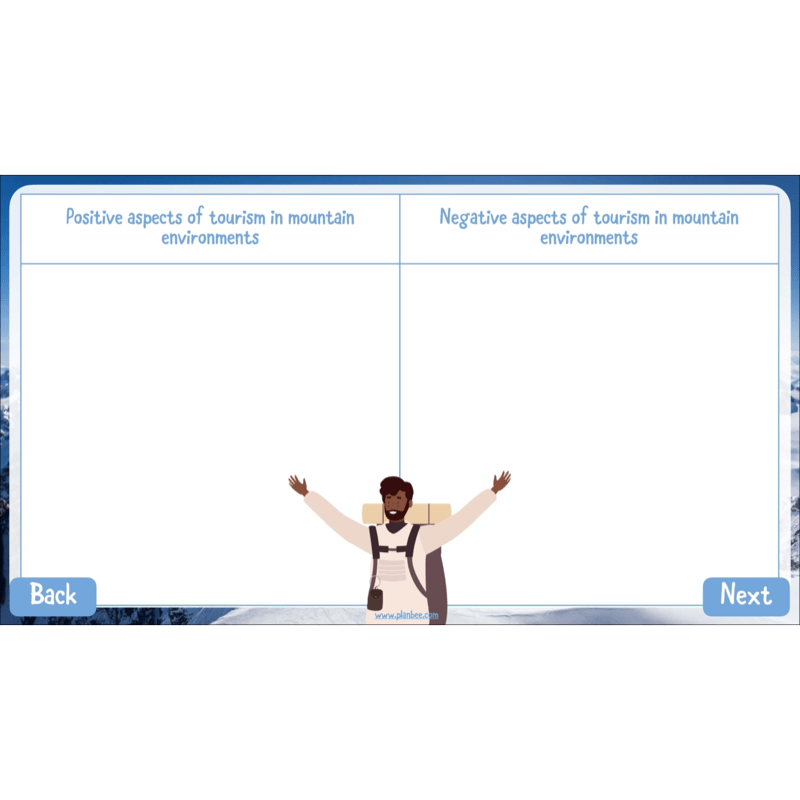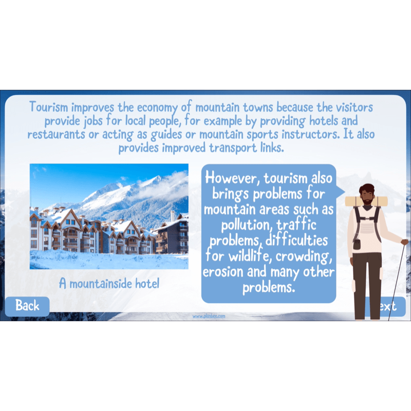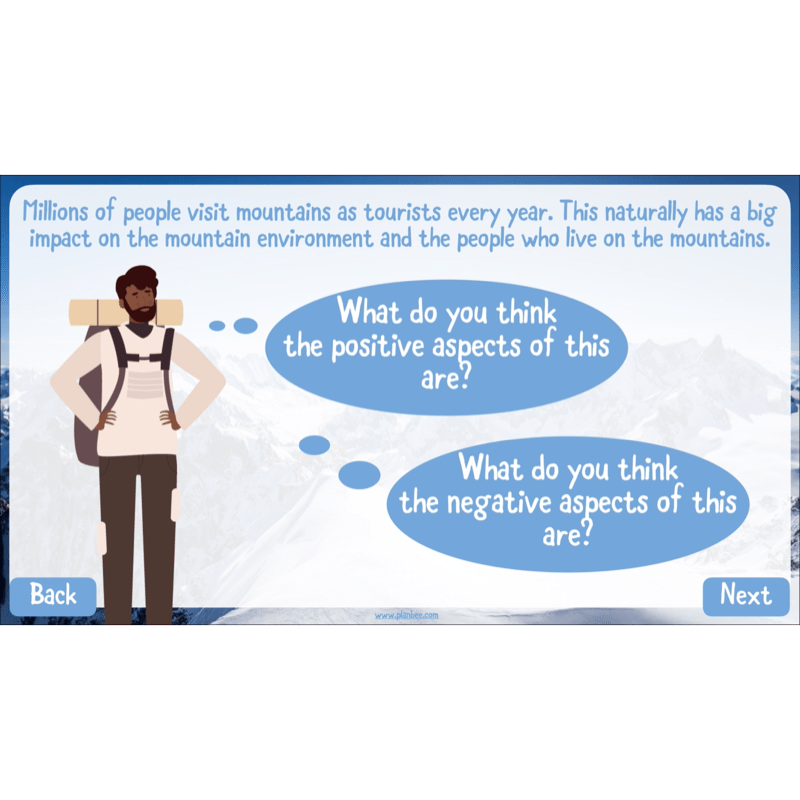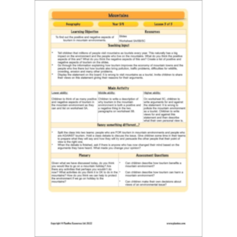 The final lesson in this Mountains Geography series looks at the effects of tourism on the mountain environment and gives your class the opportunity to consider both the positive and the negative aspects of enjoying a mountain holiday.