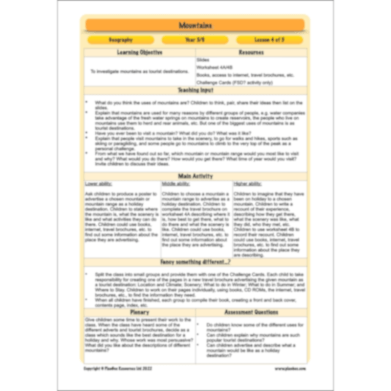 This lesson looks briefly at the uses of mountains before taking a closer look at mountains as tourist destinations, encouraging your class to think about what they could do on a mountain holiday and which mountain or mountain range they would most like to visit from what they have found out so far.