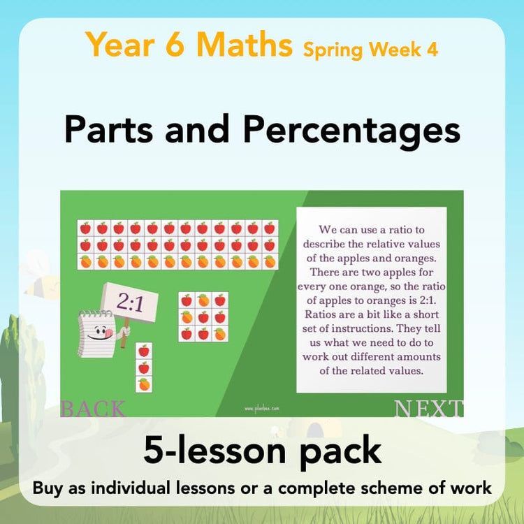 That's not all that's covered in these extensive KS2 lessons, though: your class will also build on their understanding of percentages as they solve problems involving the calculation of percentages and the use of percentages for comparison. The included slides show, in simple steps, how to find percentages of amounts and increase or decrease them, too.