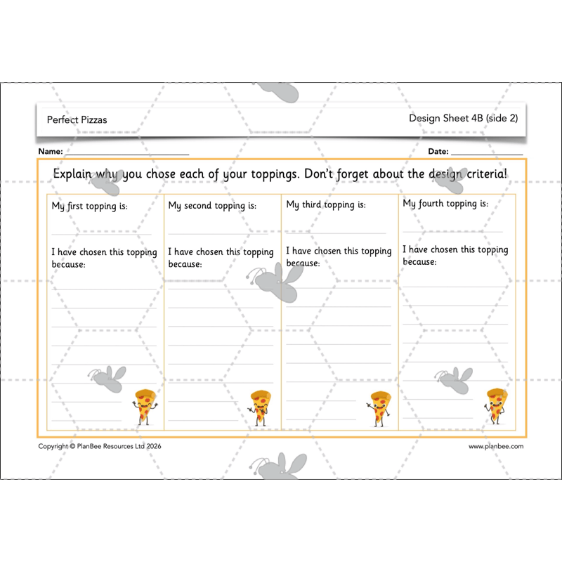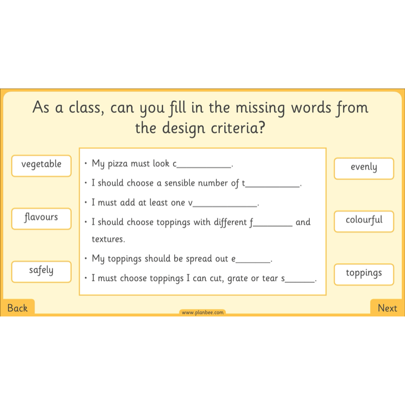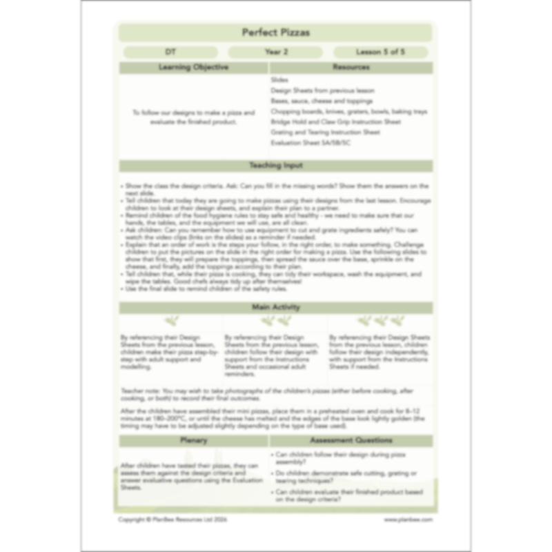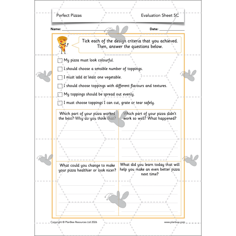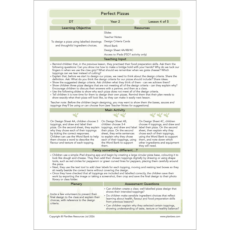 The class will evaluate suggested criteria and consider whether they are achievable, before analysing three example pizza designs that do not meet all expectations, explaining what is missing and why. In their independent activities, children will create their own detailed pizza plans to support successful pizza making in the next lesson.