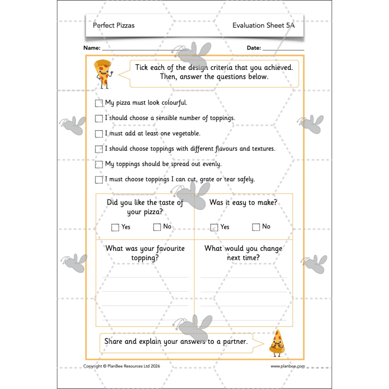 Once they have been cooked and tasted, children evaluate their pizzas against the design criteria and answer questions about what worked well and what they could improve next time.