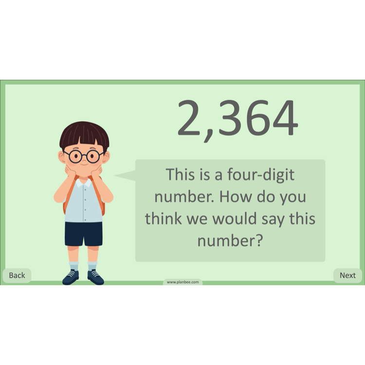 This series of lessons begins with a recap of what a three-digit number is and what the place value of each digit is. The children will then be introduced to the four-digit numbers. They will identify the value of each digit within a four-digit number and have plenty of opportunities to practise writing numbers in numerals and in words.