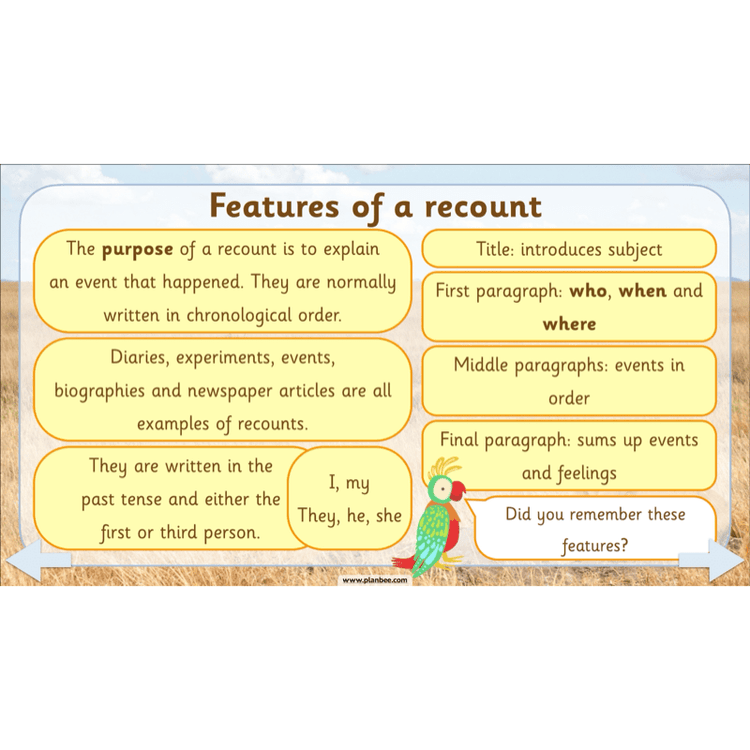 In this recount features Year 2 lesson children will discuss and locate the features of a recount. They will think about what chronological means and find evidence of the features of the genre in example texts. Your class will also have the chance to answer a range of comprehension questions to demonstrate their understanding.