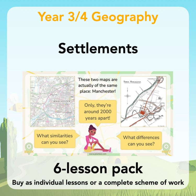 Travel back to the time of the early village settlers as your class discover how towns and villages got their names and why certain areas were chosen as settlements. Then return to the present day and look at settlements and explore maps of surrounding areas. These Settlements KS2 Geography lessons are designed to give the children in your class a greater understanding of what settlements are, how settlements were formed and also to improve their map skills. Your class will discover how reading maps can tell them what a settlement is like. They will also get the opportunity to take on the role of town planner as they design their own settlement.