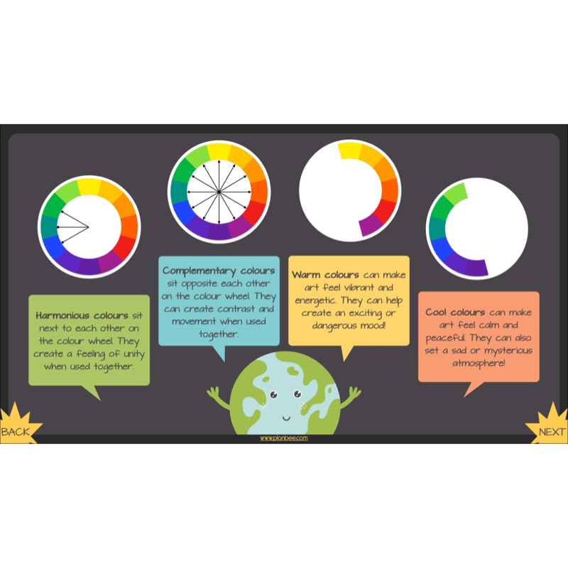 Here, children recap colour theory and learn about warm and cool, harmonious and complementary colours and their characteristics and position on the colour wheel.