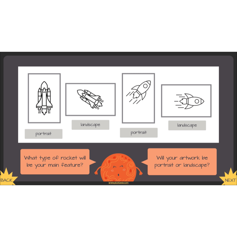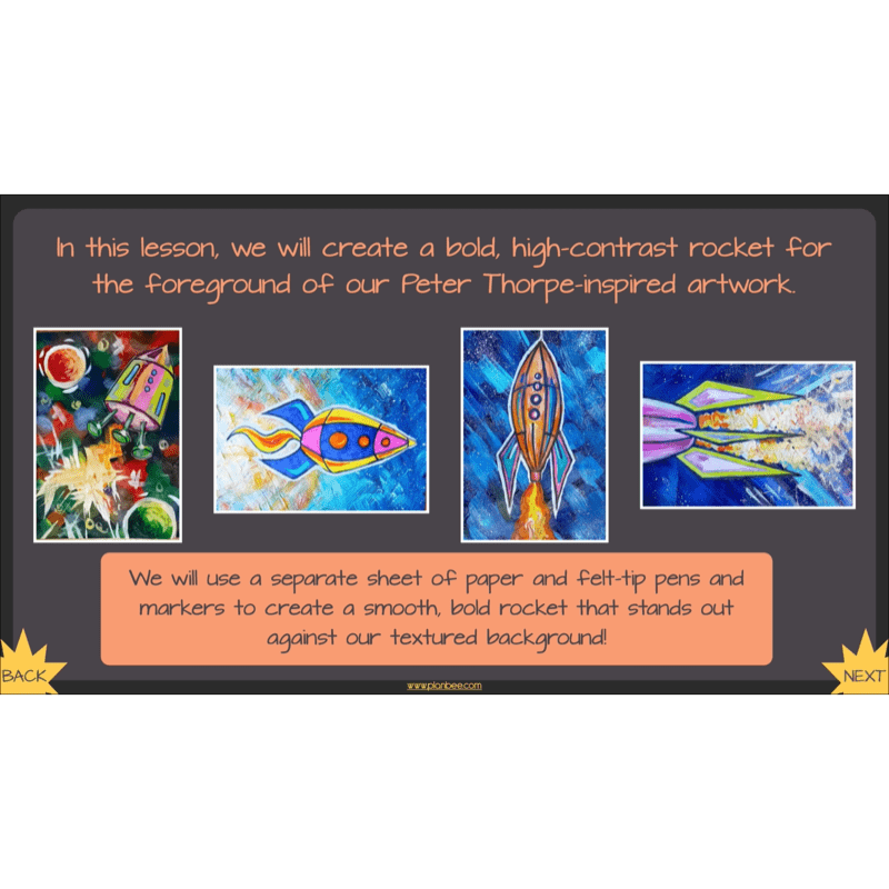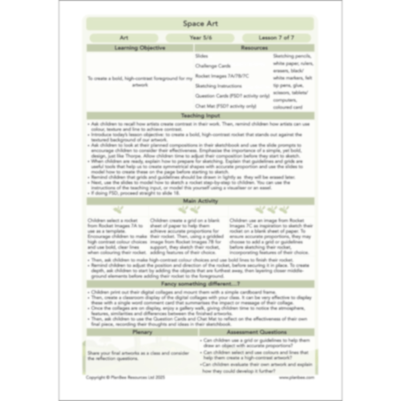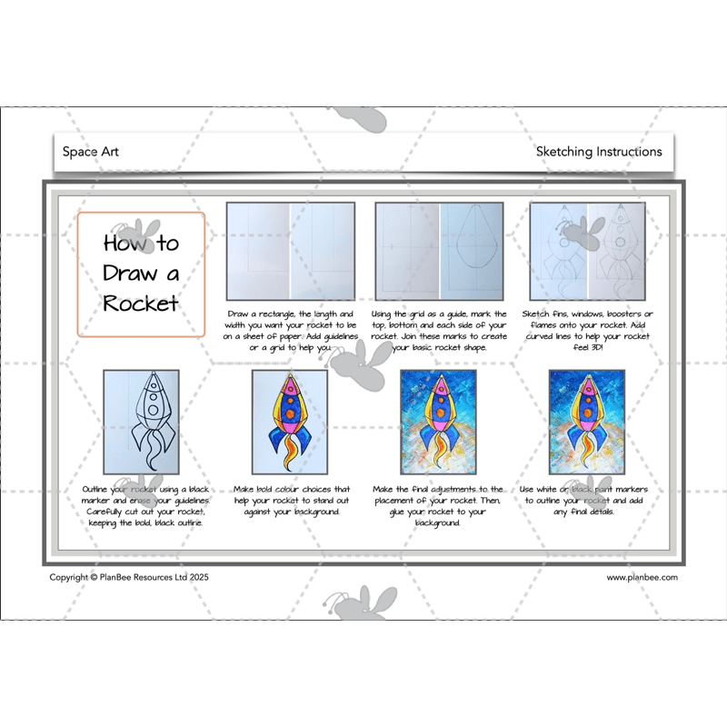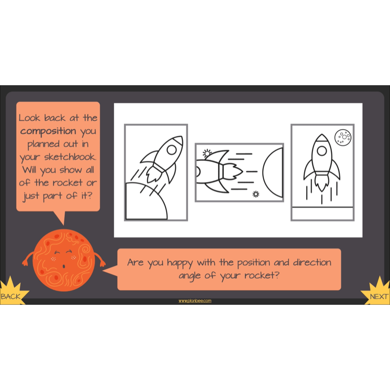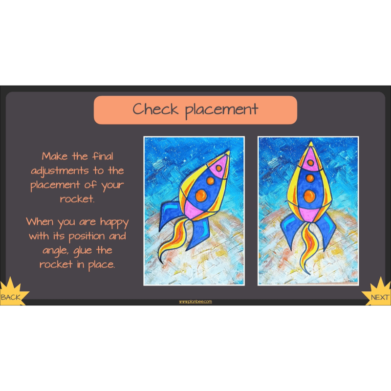 In this last lesson, children review and make adjustments to ensure their final composition is bold, dynamic and impactful. Children are guided through step-by-step instructions for sketching a rocket using a grid or guidelines for support and encouraged to use clear, bold lines and make high-contrast colour choices to make their rocket stand out.