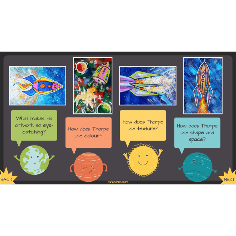 In this lesson, children explore how to create bold and dynamic compositions inspired by the work of space artist, Peter Thorpe. They begin by discussing how Thorpe uses colour, texture, shape, space, contrast and balance in his work.