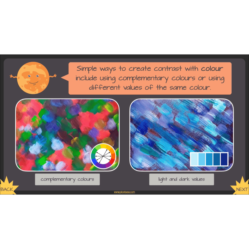 Applying this understanding children make their own choices about colour, texture, and line and create a vibrant, dynamic background that emphasises movement and contrast. Alternatively, children explore contrast by layering and arranging elements in a digital space-themed collage.