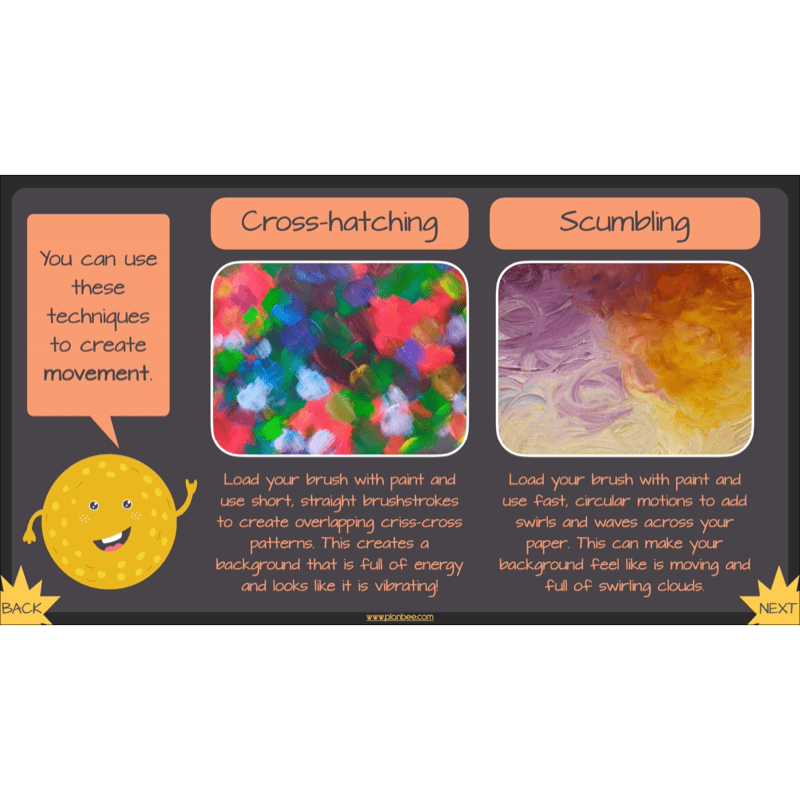 In this next lesson, children explore a variety of painting tools and techniques that they can use to create texture and movement in their artwork. During their independent activity, children experiment with a range of tools and techniques, developing greater control and precision as they practise.