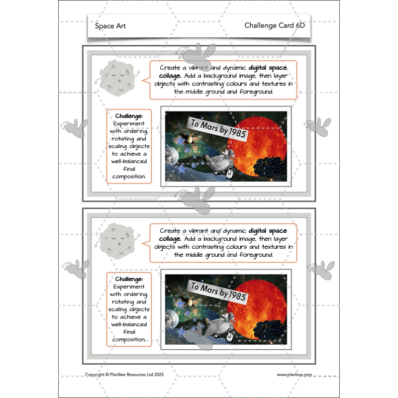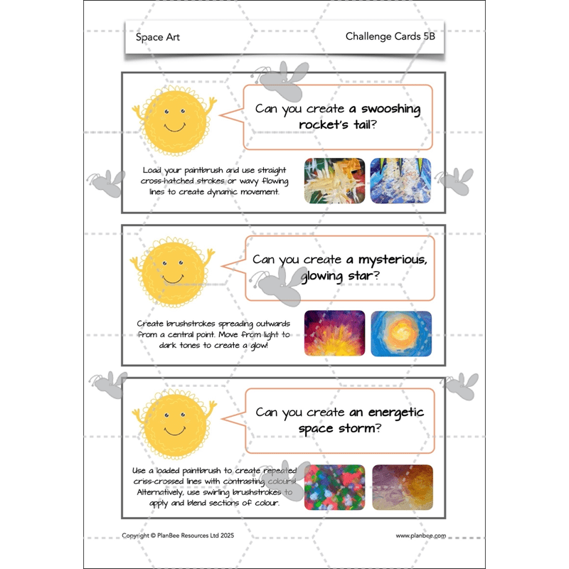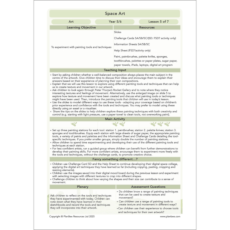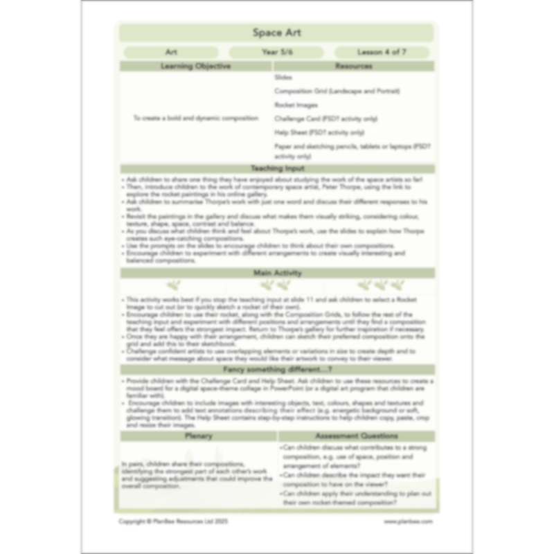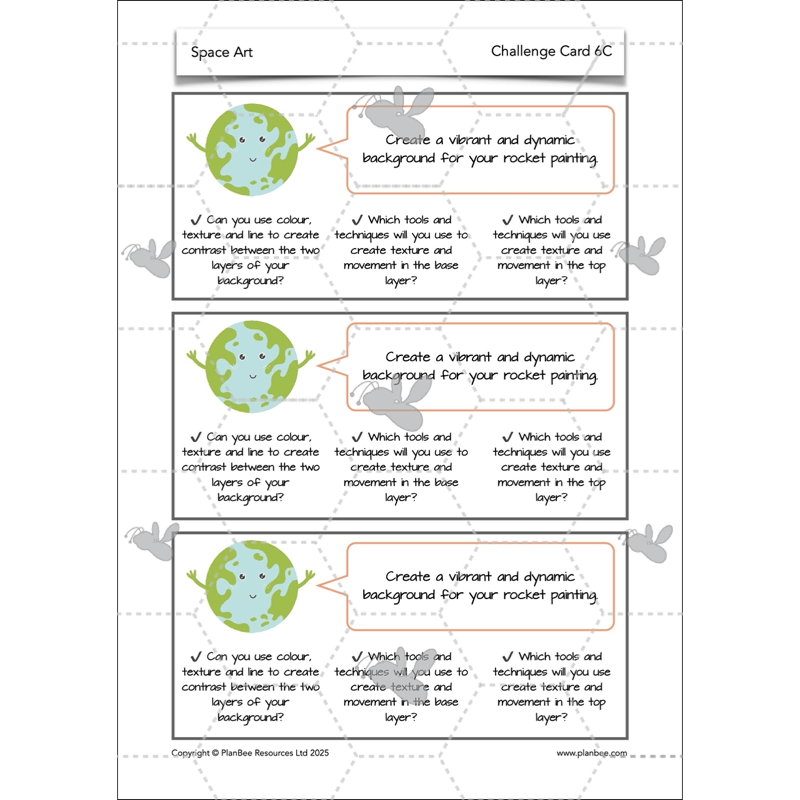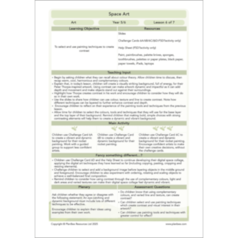 Over the course of seven fully prepared lessons full of practical activities, your class will develop their skills creating compositions, drawing, painting and colour theory. Children will experiment with a variety of art tools and techniques, learning to create space-themed artworks that evoke different moods, from peaceful, atmospheric spacescapes to bold, high-energy rocket paintings. An alternative pathway enables children to create digital space collages, developing key digital design skills.