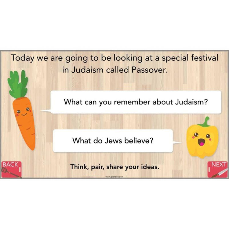 This lesson starts by recapping briefly what Judaism is and what Jews believe. They will then read the story of the exodus from slavery in Egypt and be introduced to the festival of Passover. They will look at the foods on the seder plate, what they symbolise and how they relate to the Passover story. There is even the option to create their own colourful seder plates out of felt.