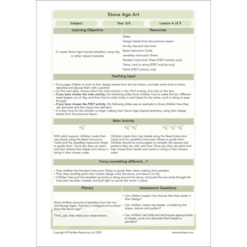 This Stone Age Jewellery KS2 Art pack is ready to download, and includes an easy-to-follow plan, a range of printable resources and activity ideas, as well as engaging and informative PDF slides for the teaching input.