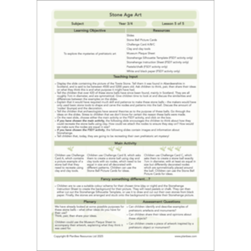 Each Stone Age Art lesson comes with a detailed plan, a set of informative and engaging PDF slides for the teaching input, differentiated activity ideas and printable resources for your class's independent activities.