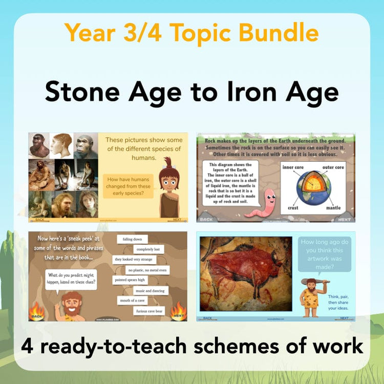 Take your class back to the prehistoric era with this Stone Age to Iron Age Topic Bundle! This pack includes four complete PlanBee schemes of work - in History, your class will explore the features and developments of the Stone Age, the Bronze Age and the Iron Age; in Science, they will find out about different kinds of rocks, explore a variety of soils and discover the fascinating world of fossils; in Art, children explore and create their own versions of prehistoric cave paintings, sculptures and jewellery; and in English, use the wonderful book, 'Stone Age Boy' as a basis for reading comprehension and writing composition!