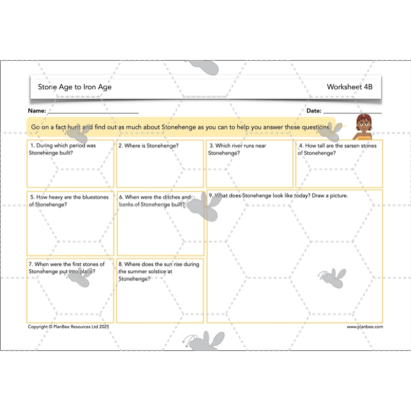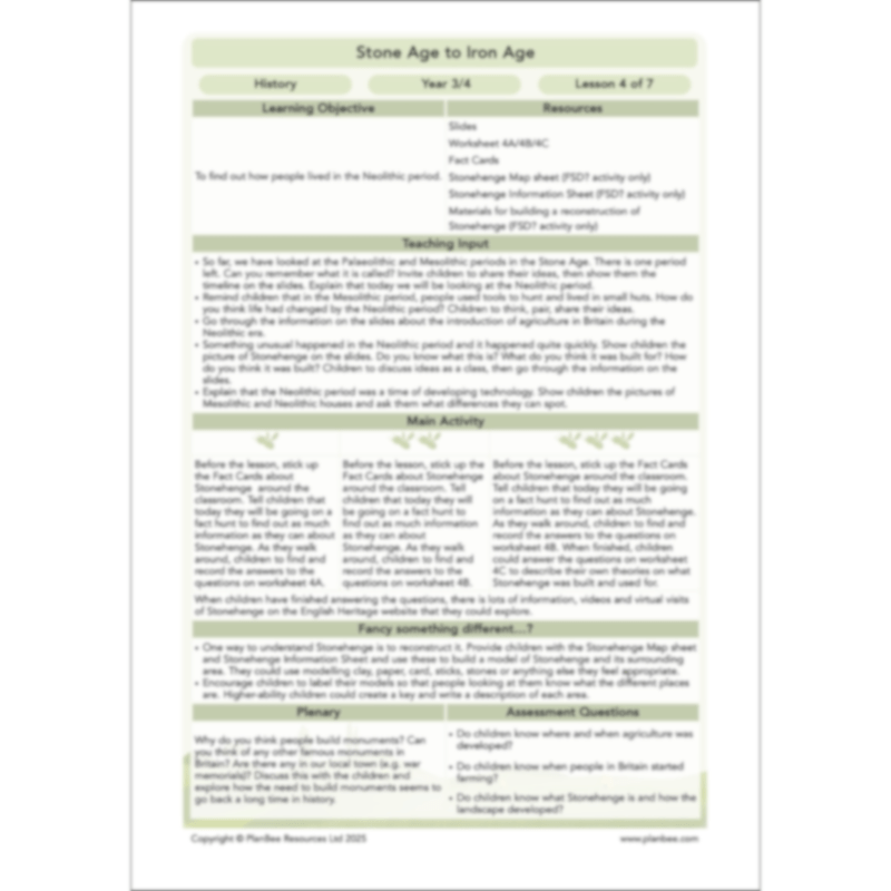 This Stonehenge KS2 History lesson will start by providing some context and looking at how life in the Stone Age had moved on by the Neolithic period and how people had started farming. It then goes on to look at Stonehenge, challenging your class to think about what they can learn about the Stone Age from this site. In their independent work, your Year 3 or Year 4 class can go on a Stonehenge fact hunt using the fact cards and maps provided, or reconstruct Stonehenge for themselves using the information given.