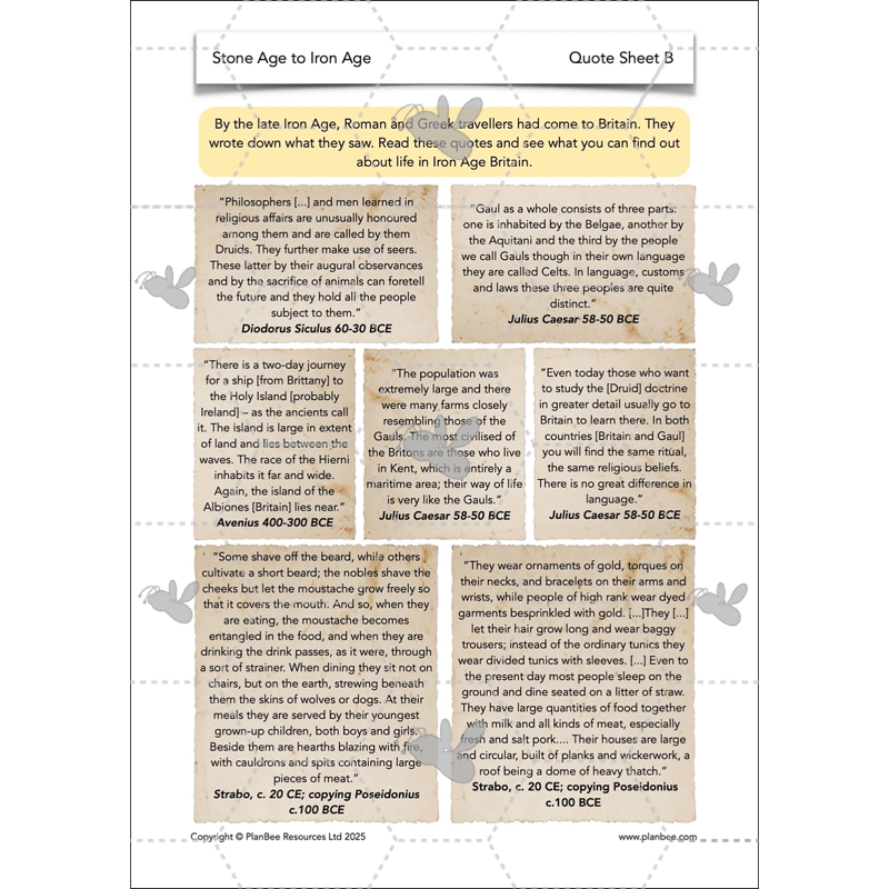 Download this Iron Age KS2 History lesson for Year 3 and Year 4 to explore with your class what life was like in Iron Age Britain. Your children will explore farmsteads, hillforts and more before looking at Celtic and Roman influences on Britain. Finally, they will read accounts of society at the time from Roman writers who visited Britain.