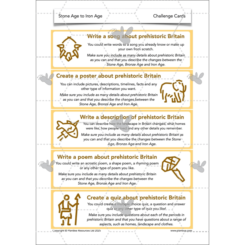 The final lesson in this series gives your class the chance to consolidate all the Stone Age to Iron Age facts that they have learnt throughout the scheme of work. They are challenged to order changes and developments chronologically before having the chance to express their Stone Age to Iron Age understanding in a variety of fun ways.