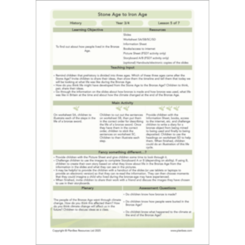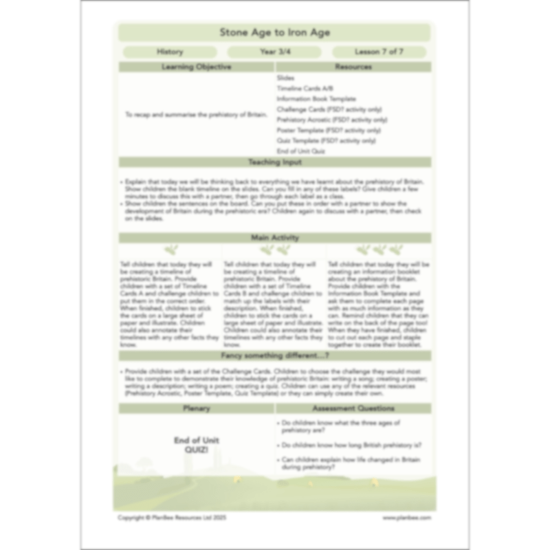 This Stone Age to Iron Age Year 3 and Year 4 History scheme of work will take your KS2 class on a fascinating journey as they explore prehistoric Britain. Your children will explore a million years of prehistory as they learn about the Stone Age, Bronze Age and Iron Age, discovering how humans first came to Britain, how they lived and what developments were made during each era. They will also develop their history skills as they consider how we know about prehistory (the period before written evidence) and find out what archaeologists do. By the end of this series of seven Stone Age to Iron Age KS2 lessons, your class will have developed a broad understanding of the prehistoric era.