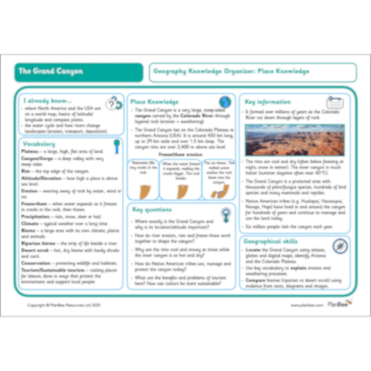 This Grand Canyon KS2 planning pack for Year 5 or Year 6 contains seven ready-to-teach Geography lessons that will teach your class everything they need to know about the world's most famous canyon. Your children will discover how the canyon was formed, the climate conditions and different environments in and around it, how the land is used for tourism and by American Indian tribes and much, much more!