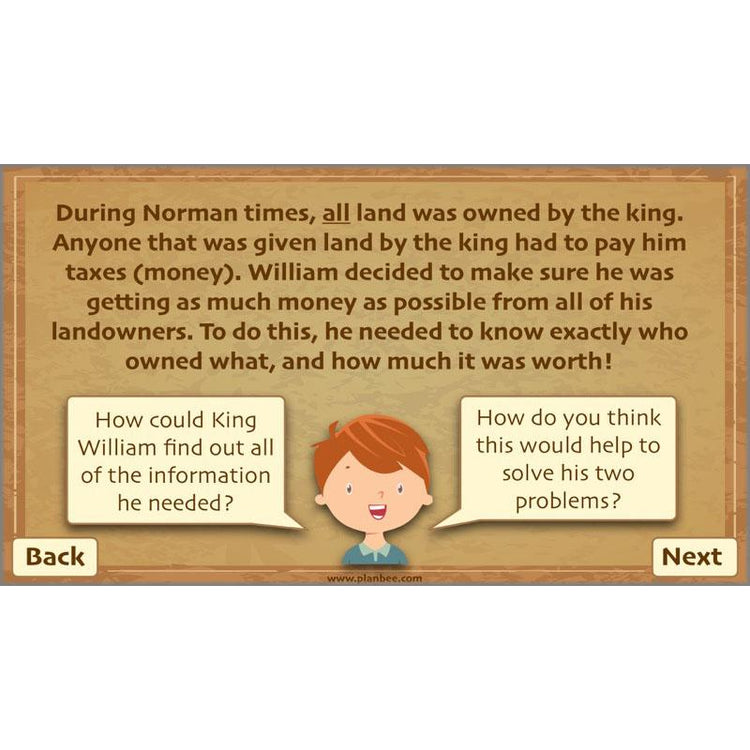 In this final lesson of the Norman Conquest series, your children will find out why and how the Domesday book was created. They will look at an extract from the book and answer questions about it. Your children will also begin to understand the importance of the document for historians. In their independent activities, your class will re-enact the collection of information for the Domesday book. Alternatively, they will learn about the modern day census, then conduct their own to find a solution to a given problem.