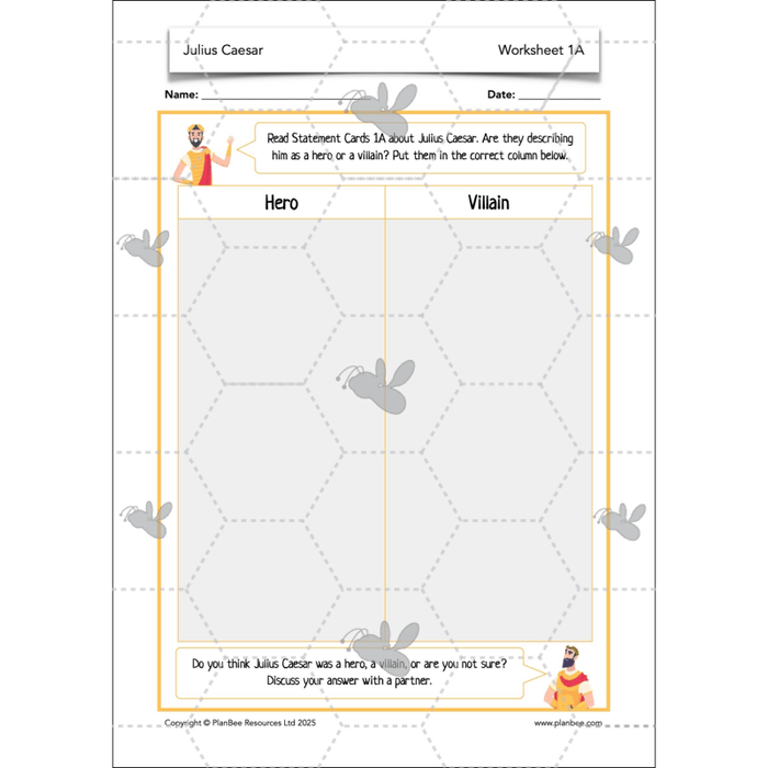 After reflecting on why people from the past are remembered, children will explore who Julius Caesar was by learning about key facts in his life, including his rise to power, his military victories, and how he tried to improve the lives of Roman citizens. During class discussions and in their independent activities, children will discuss and decide whether Caesar’s actions make him a hero, a villain, or both, using evidence from his life.