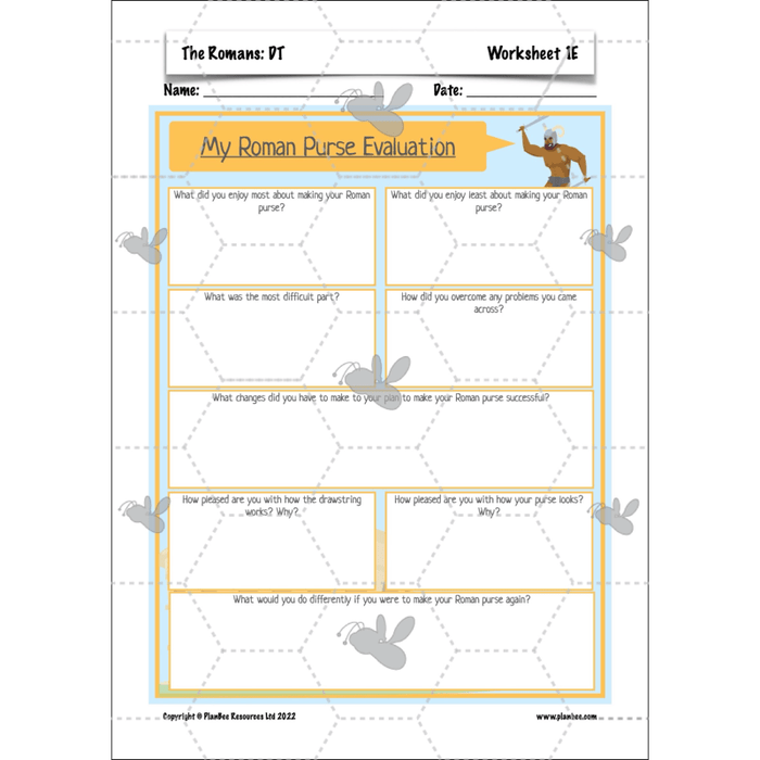 The provided slideshow guides your class through the process of making a simple Roman coin purse using a series of simple steps. During their independent work, they can then design and make their own Roman purse, putting their own twist on the basic design, before evaluating their finished products.