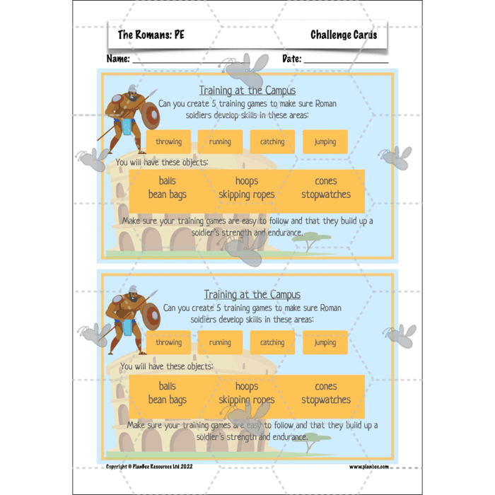 Your Year 3 or Year 4 class will undertake some Roman soldier training in this lesson as they are taken back to the Campus of ancient Rome to find out what was physically required to train a Roman soldier! The provided slideshow gives your class a brief overview of Roman soldier training before challenging them to undertake a variety of physical challenges to see how well they would have fared as a Roman soldier.