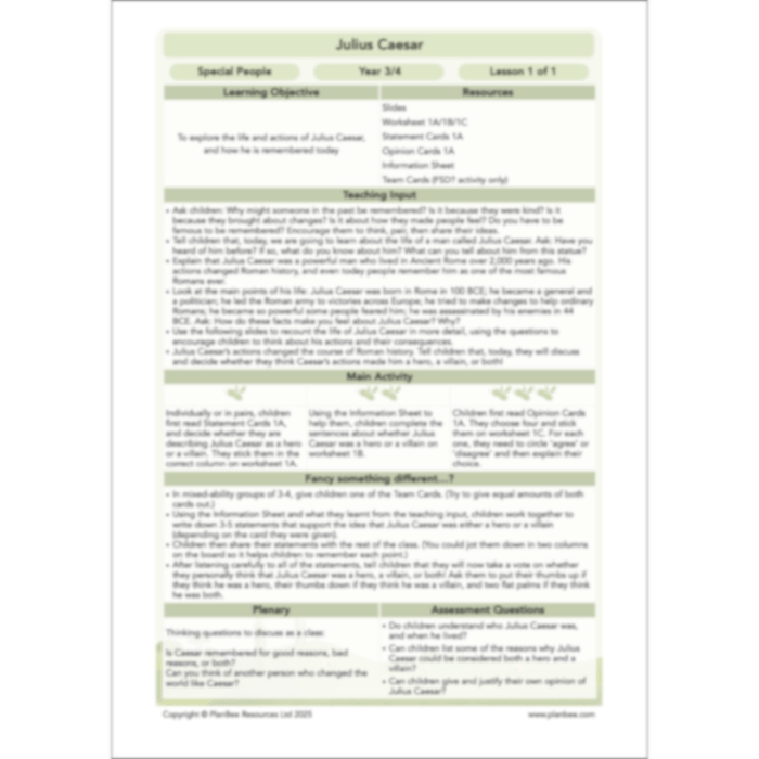 This Julius Caesar KS2 lesson pack contains everything you need for a thought-provoking lesson - a detailed plan, a set of informative and engaging PDF slides for the teaching input, differentiated activity ideas and printable resources to support your class in their independent learning.