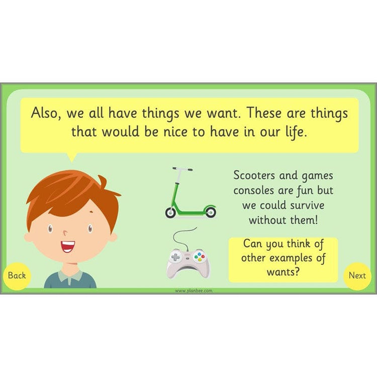 In this lesson, children will learn the difference between wants (things that would be nice to have and improve our lives) and needs (things that we need in order to survive).