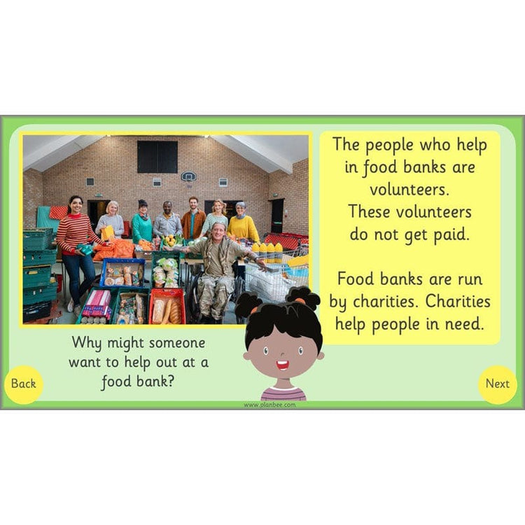 In this lesson, your class read ‘It’s a No-Money Day’ by Kate Milner (not included) to introduce the idea that not everyone has enough money for what they need. Children explore what food banks are and how they help people in need.