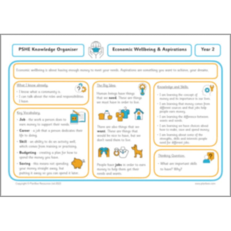 This Year 2 PSHE Knowledge Organiser has been created to complement our PSHE Economic Wellbeing and Aspirations strand. It is designed to support your children’s understanding of key vocabulary linked to this scheme of work. A thinking question and a big idea have been included to encourage your children to think deeply about this topic.
