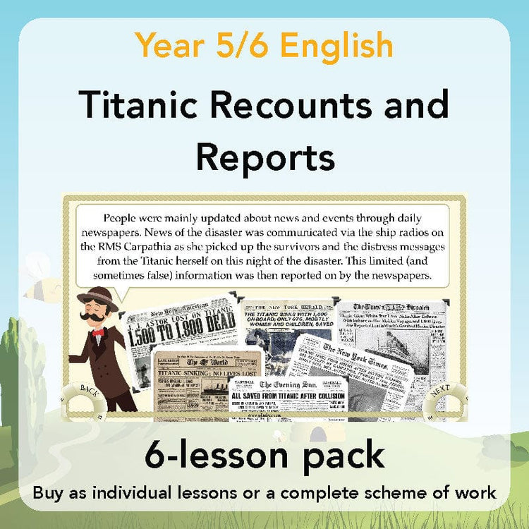 This ready-to-teach Titanic News Report lesson provides everything you need to challenge your class to create their own televised Titanic news reports, including a detailed lesson plan, a slideshow for the teaching input, differentiated activity ideas, and a range of printable resources to support your children as they write their scripts.