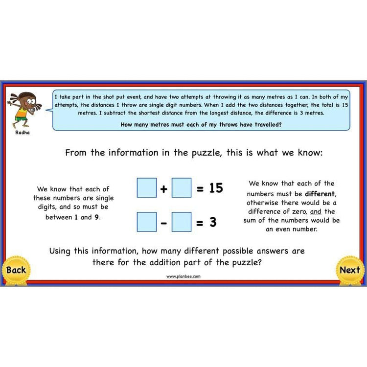 In this lesson, children use their knowledge of addition and subtraction to solve puzzles using the trial and improvement method. They develop their reasoning skills by explaining their thought processes and the steps they need to take in order to narrow down the possible answers and find the solution. In their independent activities, children will use this method to solve or even create their own puzzles based around sports day medal winners.
