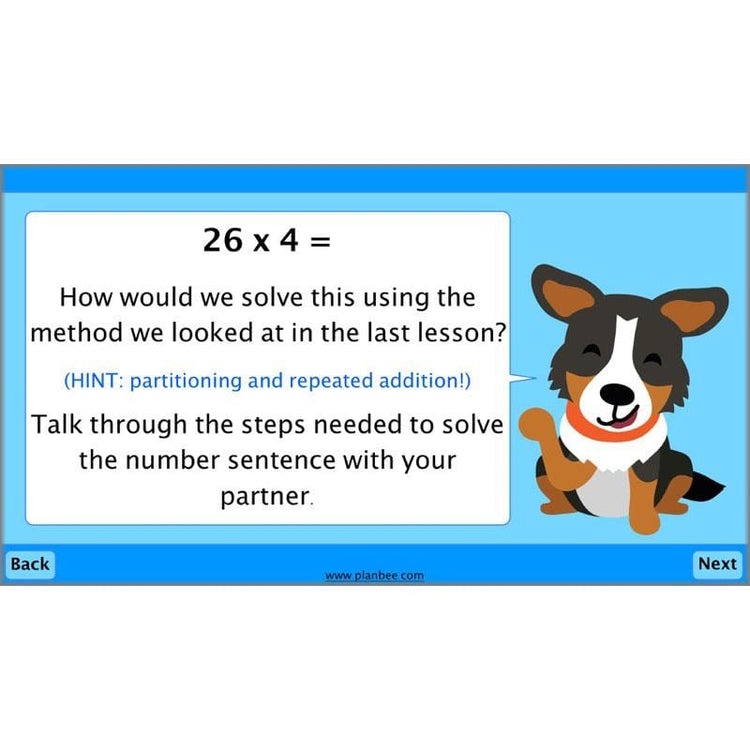 In this lesson, children will be introduced to the grid method for solving number sentences involving multiplying larger two-digit numbers by a one-digit number. They will learn how to enter the information needed into the grid, and where to place their answers before recombining them. In their independent activities they will work in groups and become ‘solvers’ and ‘checkers’ to find the answers to given grid method multiplications. Alternatively, children will use the grid method to investigate which number sentences will give them the highest and lowest answers.
