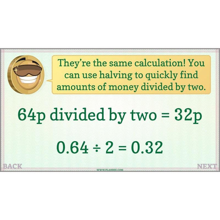 Before getting into dividing amounts of money by more than two (that's in the next lesson in this Complete Series!), demonstrate methods for halving money by partitioning amounts. The included slides explain how remainders are a little different when working with money, and how to find them. After that, there's a choice of activities where children can practise halving money, including using bank notes and coins when solving two-step problems.