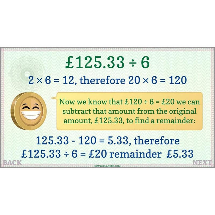Rather than purely focussing on written methods for dividing money, this lesson firstly looks at practical, 'real-world' methods for sharing large amounts of cash. After that, the advantages of using a formal, short division method are demonstrated. Following this, children will go on to practise and consolidate their money-dividing skills, selecting appropriate methods in a variety of contexts.