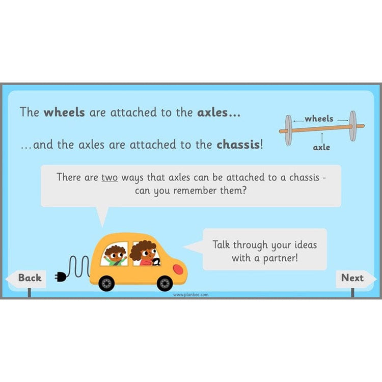 The second lesson in this vehicles series of lessons explores wheels, axies and chassis with your Year 2 class. The lesson looks at the ways that wheels and axles can be combined, as well as how axles can be attached to the chassis to make the framework for a vehicle.