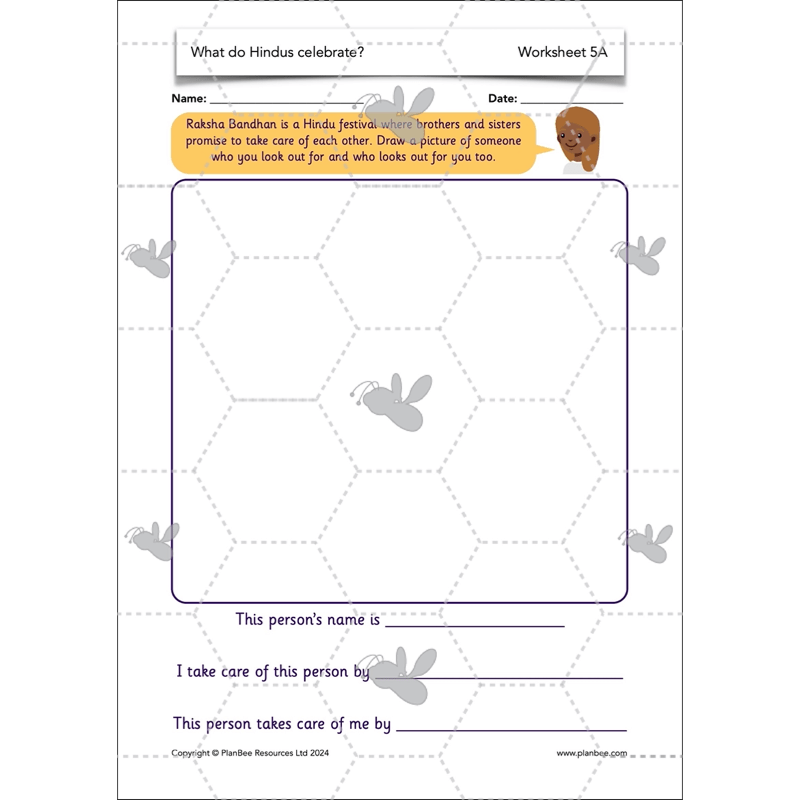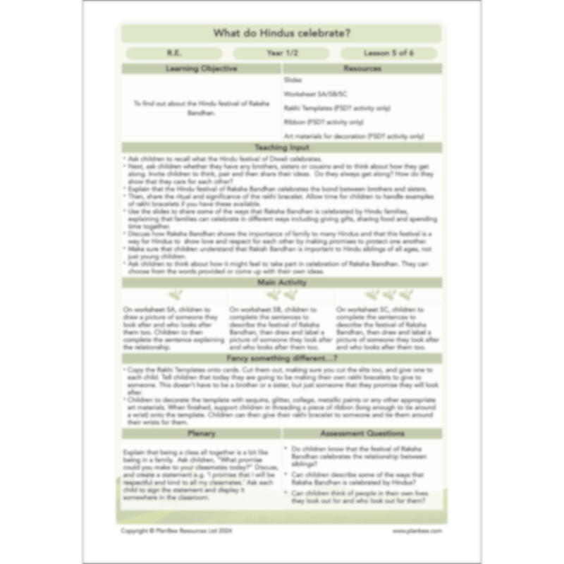 In this lesson, your class will learn about Raksha Bandhan. This Hindu festival celebrates the relationship between brother and sister. As well as exploring how Hindus celebrate this festival, such as through giving rakhi bracelets, your children will have the chance to reflect on people in their own lives who look out for them and who they, in turn, take care of.