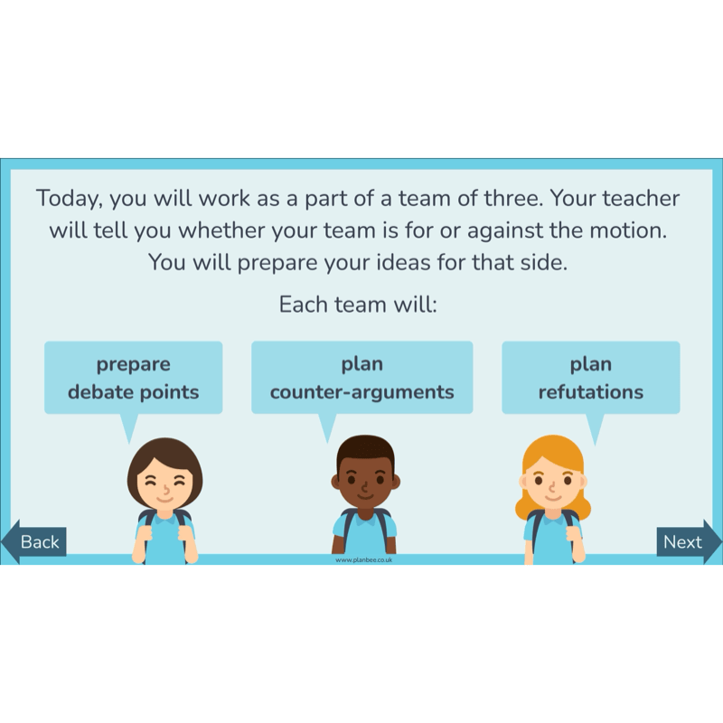 They are reminded of the debate motion and how they worked in teams to explore different viewpoints before selecting one debate point to use. Through teacher-led recap and discussion, children revisit the structure and rules of a formal debate and clarify the roles they will play. Working in the same teams of three, children take part in a series of mini-debates, responding to opposing points with counter-arguments and refutations.
