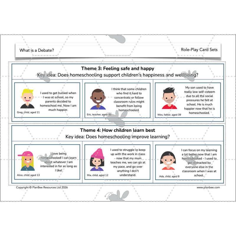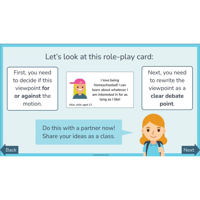 Children will explore debate points for and against homeschooling using class discussion and slides, thinking carefully, explaining their ideas, and listening to others’ viewpoints. They will then sort and rank these points in independent activities, developing their thinking, speaking and listening skills.