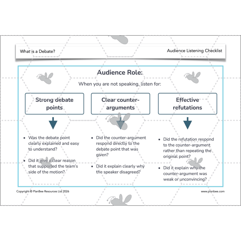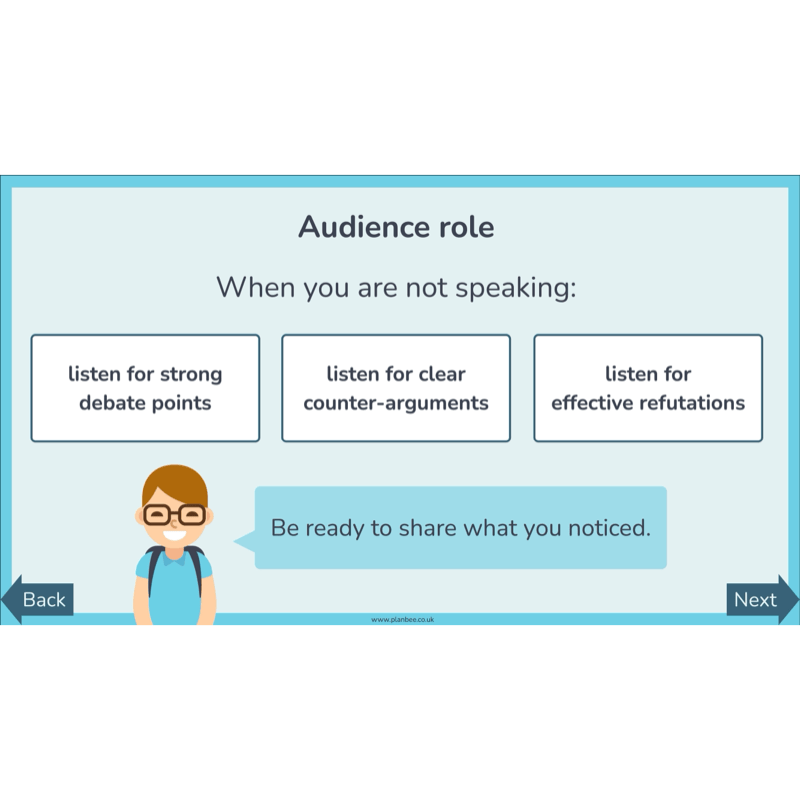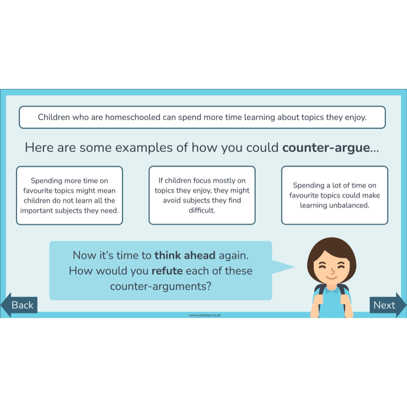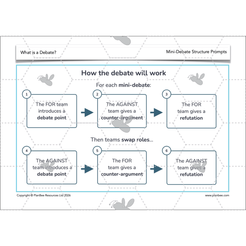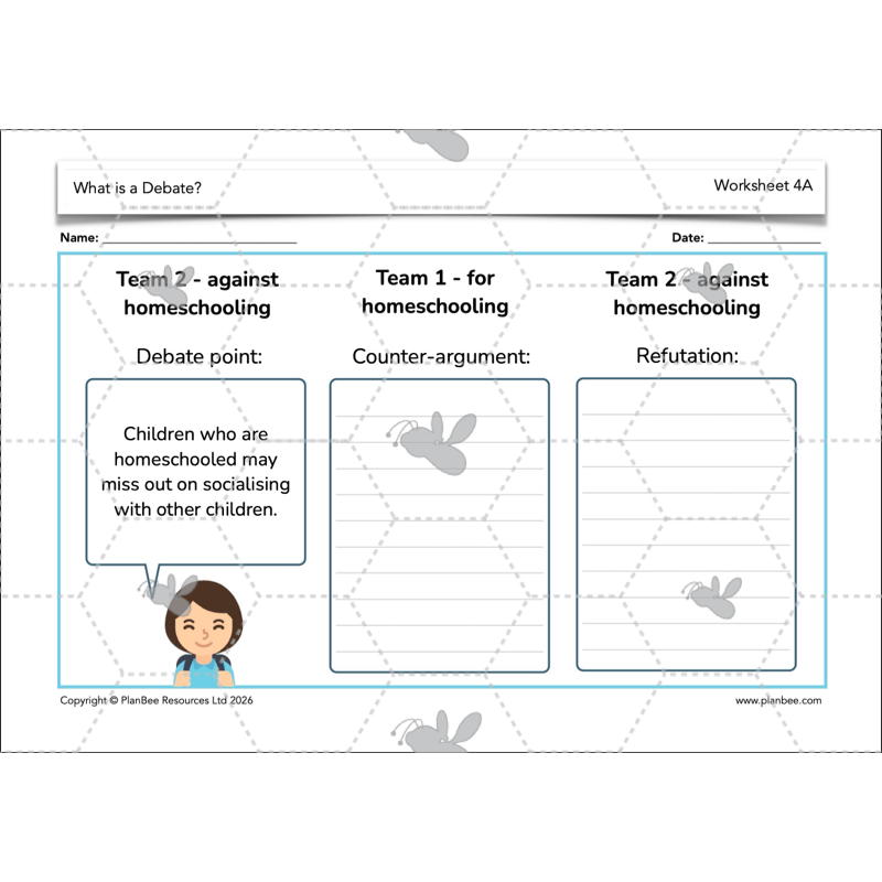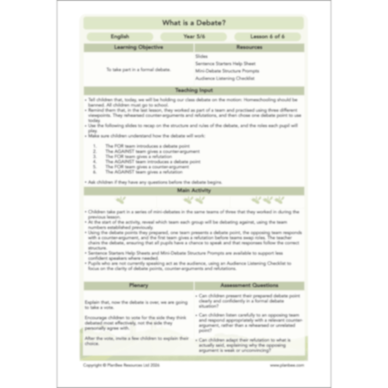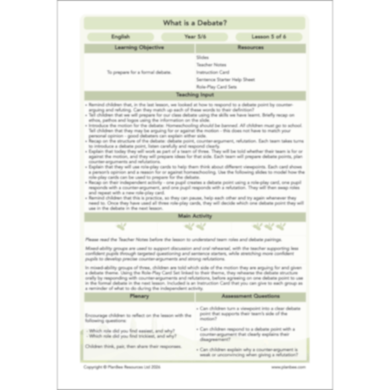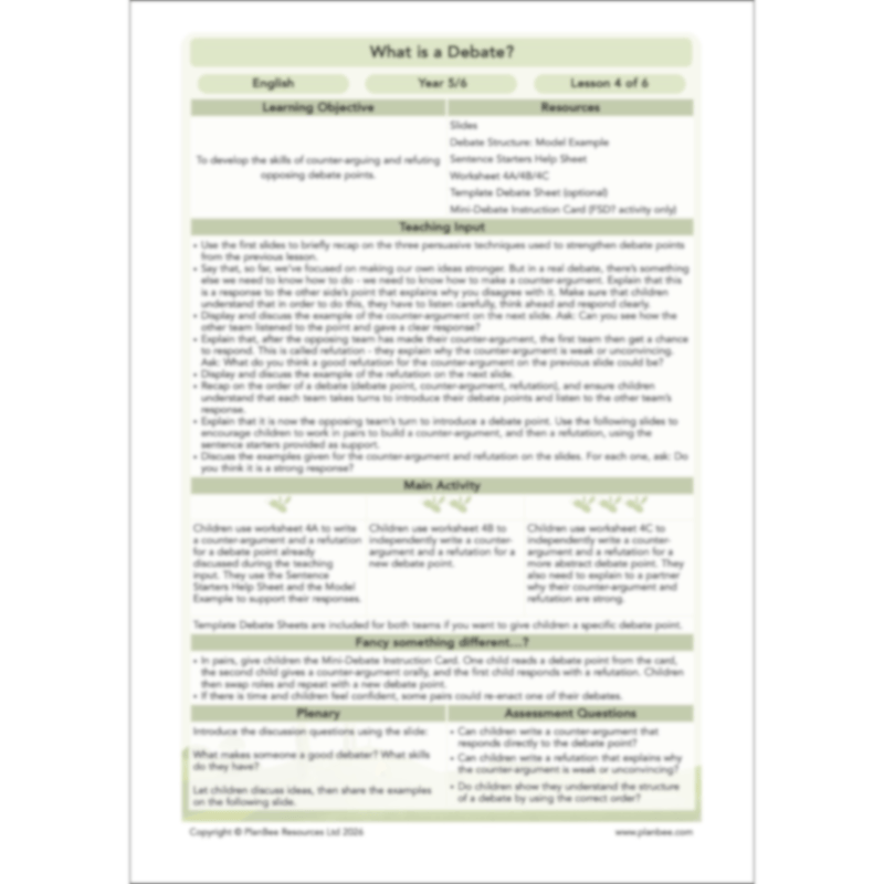 Your class are introduced to counter-arguments as a way of explaining disagreement with another team’s point, and to refutation as a response that explains why a counter-argument is weak or unconvincing. Through teacher modelling, discussion and paired activities, children explore the structure of a debate and practise building counter-arguments and refutations using sentence starters and examples for support.