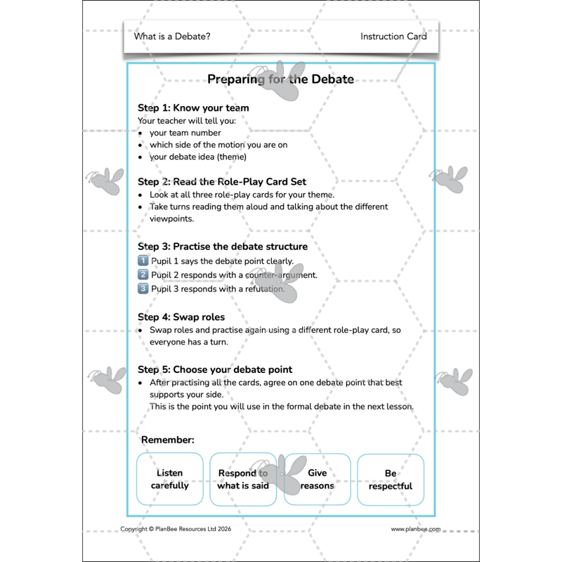 They are introduced to the debate motion and reminded that effective debaters can argue for or against a motion regardless of personal opinion. Through teacher modelling and discussion, children revisit the structure of a debate and explore how role-play cards can be used to generate debate points, counter-arguments and refutations. Working in teams of three, children orally rehearse the debate structure using different viewpoints before agreeing on one debate point to use in the formal debate in the next lesson.