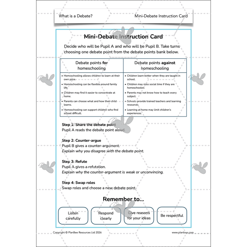 This downloadable Debate KS2 pack includes a detailed lesson plan, a set of informative slides for the teaching input, differentiated activity ideas and a range of printable resources to support your class during their independent learning.